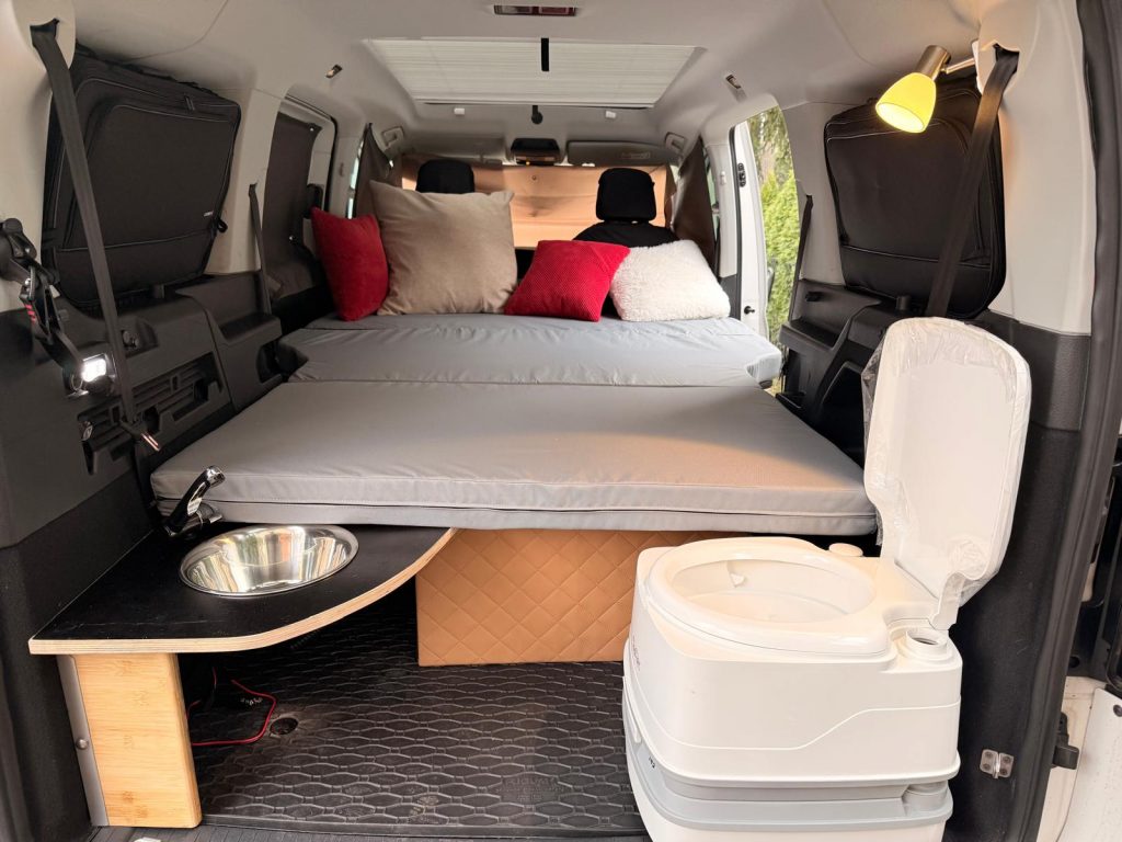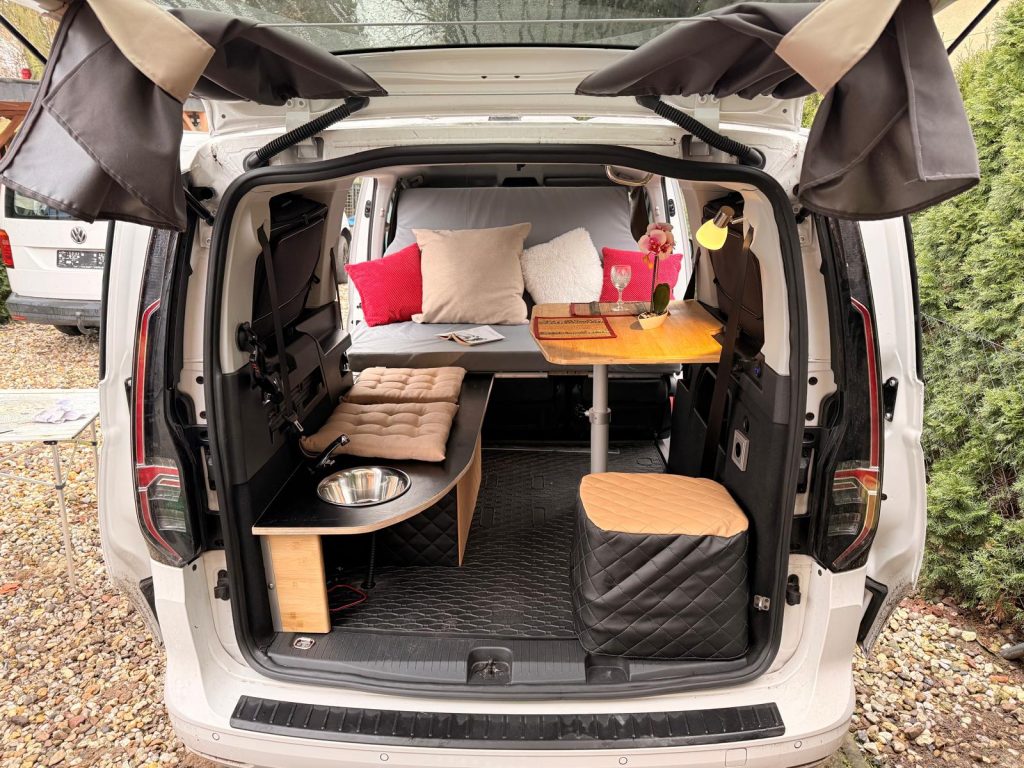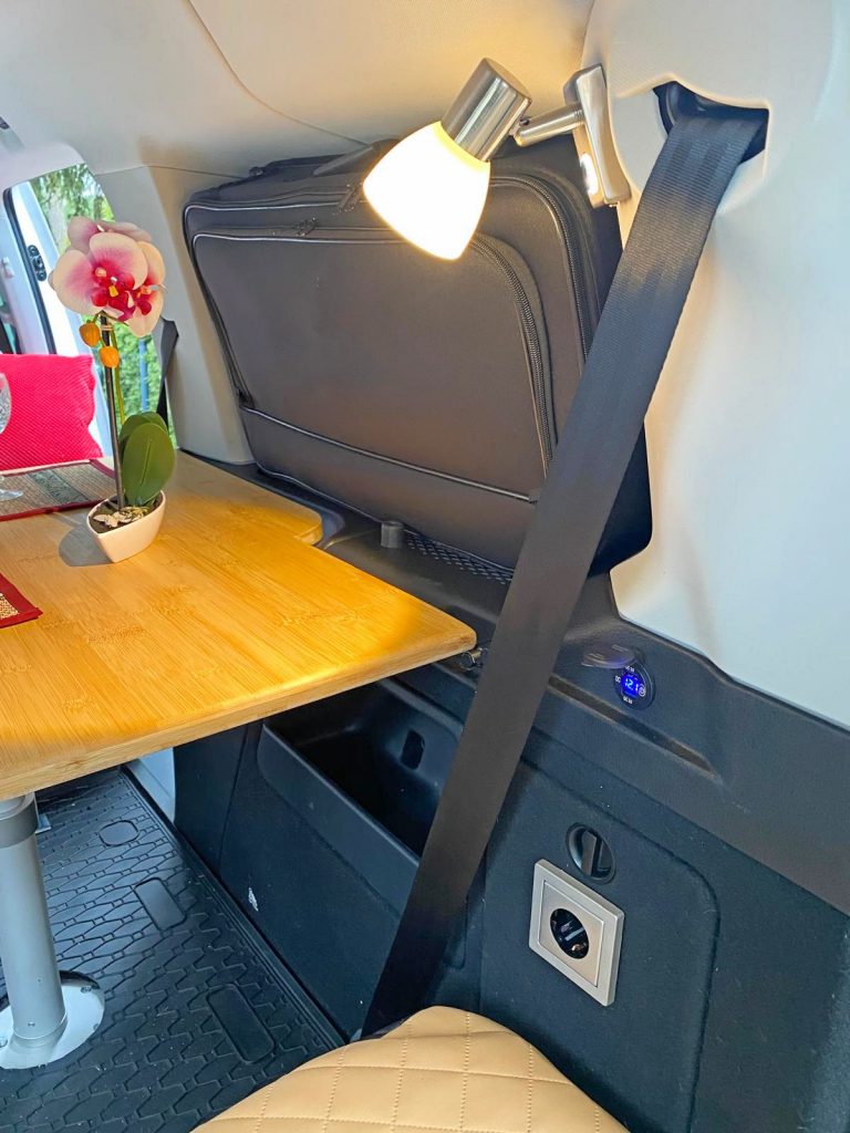 In den VW Californias ist es unmöglich zu im Bett zu Sitzen und schon gar nicht an einem Tisch.