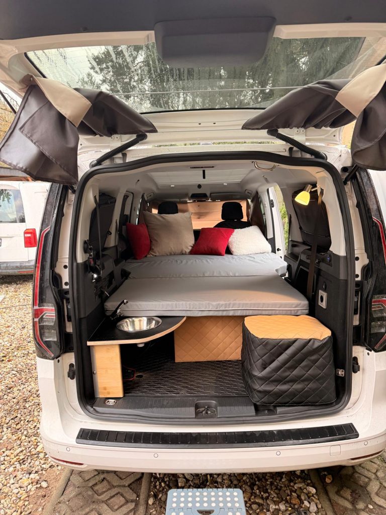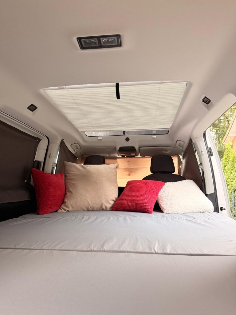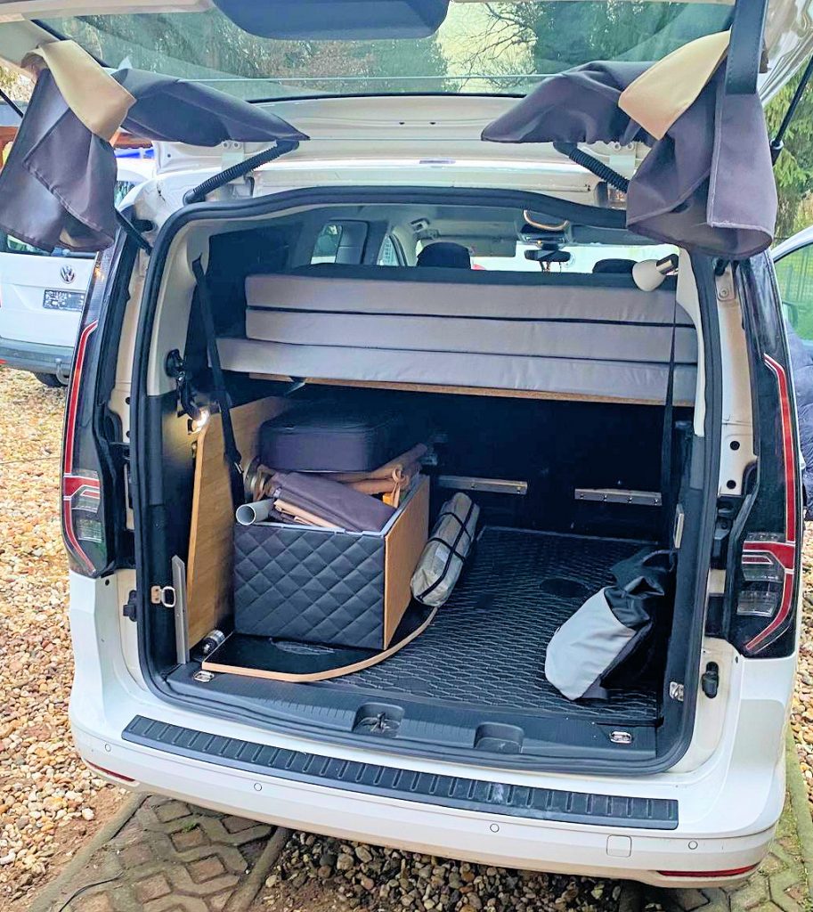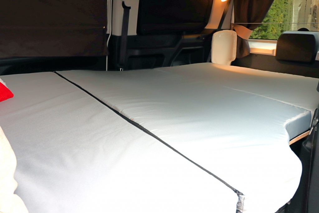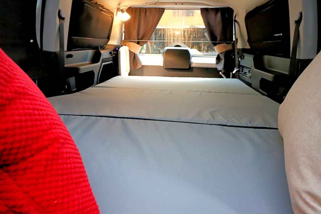– Transporthalterung im Kofferraum für das Bett zum Fahren mit Beifahrern hinten